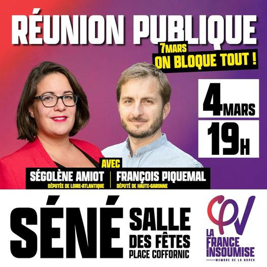 📢 Ce 4 mars à 19H avec mon collègue député @francoispiquemal rendez-vous à Séné contre la #ReformeDesRetraites avant la grande semaine de mobilisation ! ✊️💪